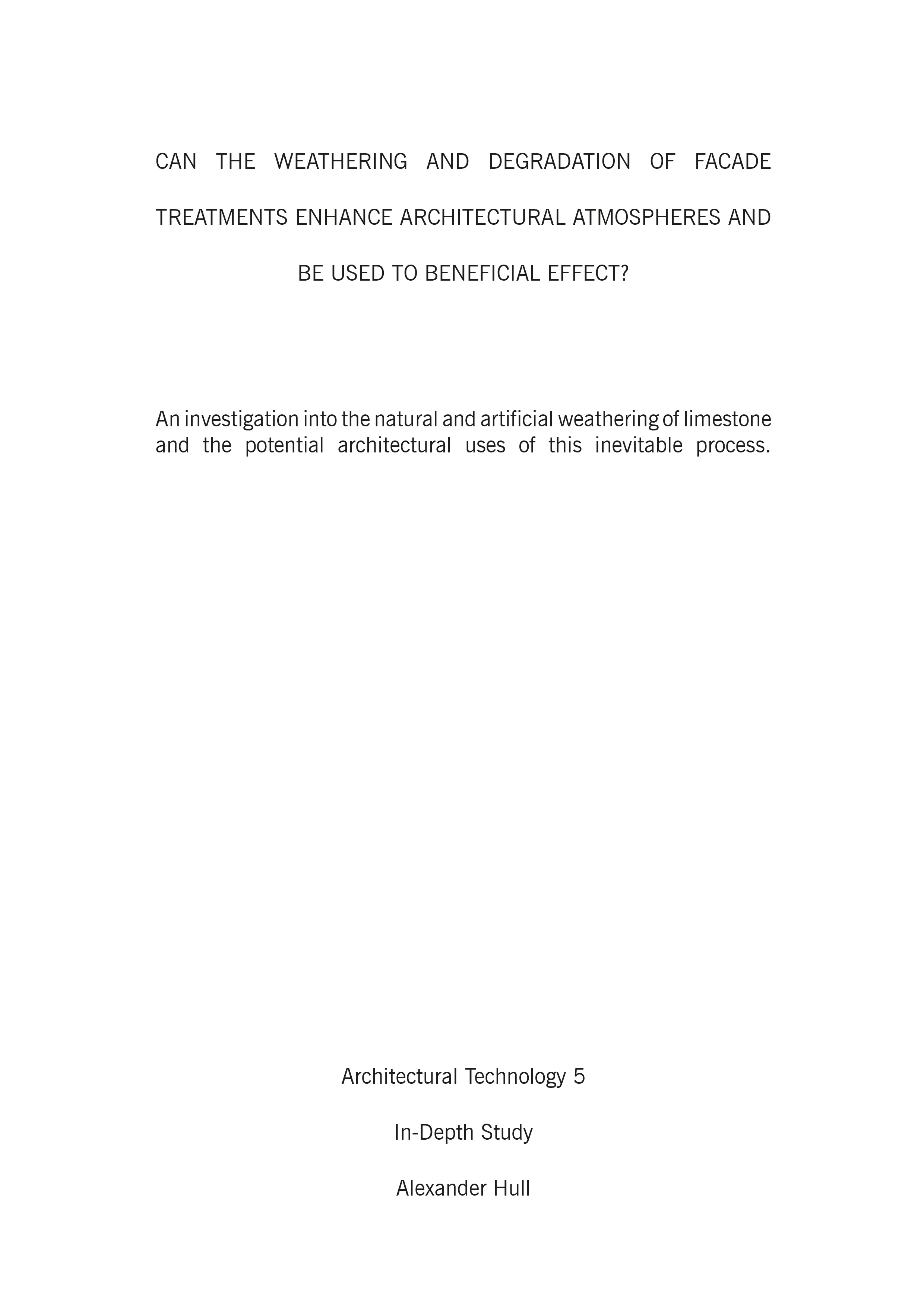 Part One consists of a primarily research based study of architectural and scientific precedents in relation to weathering entitled Can the Weathering and Degradation of Facade Treatments Enhance Architectural Atmospheres and be used to Beneficial Effect?